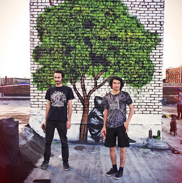 ICY (born 1985) and SOT (born 1991) are stencil artists from Tabriz, Iran, currently residing in Brooklyn, New York. Since 2006, the two brothers have contributed to Iranian and international urban art culture through their striking stencil work that depicting human rights, ecological justice, social and political issues. Their work appears on walls and galleries throughout Iran, USA, Germany, China, Norway, and globally. They transcend their histories of artistic and political censorship by using public art to envision a world freed from borders, war and gun violence.